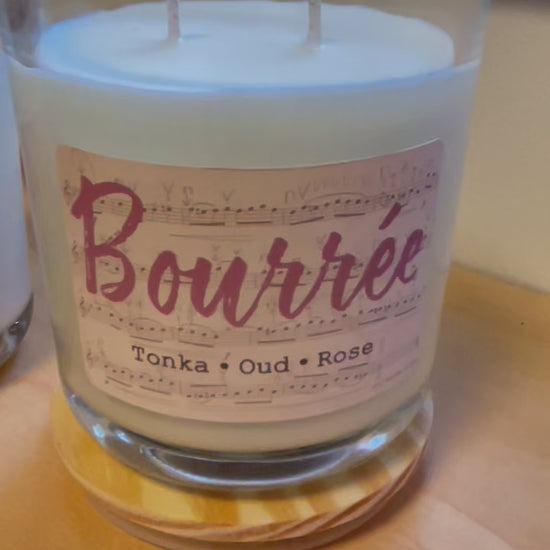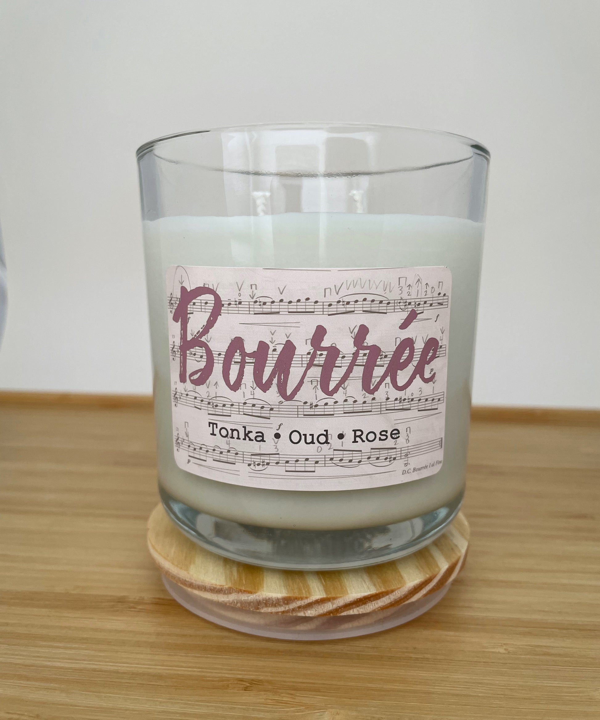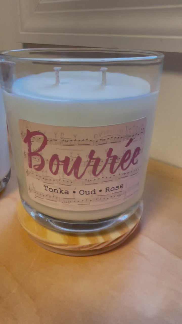 Bourrée is a French dance. This soft sophisticated scent combines woody Tonka, resinous Oud and just a hint of Rose. It has notes of soft powder, musk, amaretto and is a beautiful year round scent for your home. Our Bourrée Candle is inspired by the Suzuki music written by J.S. Bach and learned by strings students all over the world. Coco's music with bowing marks is featured on the label. 12 oz. of 100% Soy Wax, Clean Burning, Phthalate Free